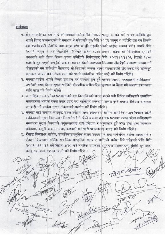 गौरमा धार्मिक सद्भाव कायम राख्ने विषयमा ५ बुँदे सहमति