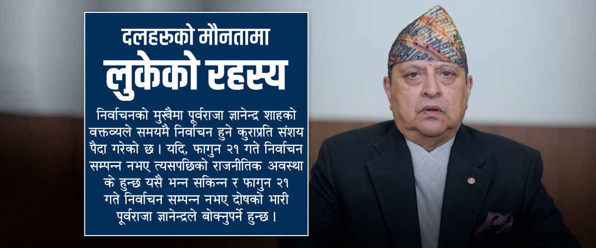 आगामी फागुन २१ गते सम्पन्न हुने प्रतिनिधिसभाको निर्वाचन नियमित निर्वाचन होइन, ०८४ मा हुने निर्वाचन जेनजी विद्रोहले निम्त्याएको आकस्मिक निर्वाचन हो, यो निर्वाचनमा पनि कुनै दलले स्पष्ट बहुमत ल्याउने संकेत देखिएको छैन । निर्वाचन परिणामपछि पनि झनै भद्रगोल हुने देखेरै पूर्वराजा ज्ञानेन्द्रले राष्ट्रिय सहमतिको आधारमा आफ्नो स्थान सुरक्षित राख्न खोजेको बुझ्न गाह्रो छैन ।