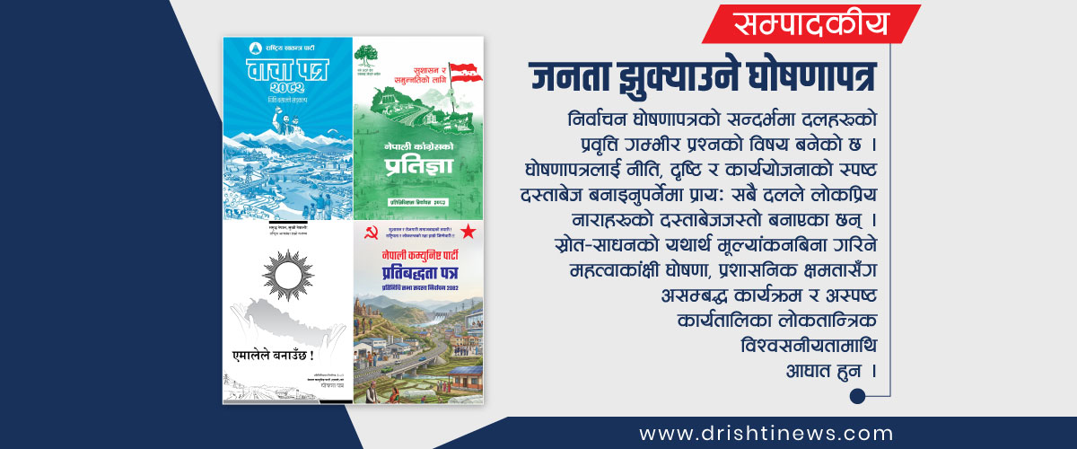 विशेषतः निर्वाचन घोषणापत्रको सन्दर्भमा दलहरूको प्रवृत्ति गम्भीर प्रश्नको विषय बनेको छ । घोषणापत्रलाई नीति, दृष्टि र कार्ययोजनाको स्पष्ट दस्ताबेज बनाइनुपर्नेमा प्रायः सबै दलले लोकप्रिय नाराहरूको दस्ताबेजजस्तो बनाएका छन् । स्रोत–साधनको यथार्थ मूल्यांकनबिना गरिने महत्वाकांक्षी घोषणा, प्रशासनिक क्षमतासँग असम्बद्ध कार्यक्रम र अस्पष्ट कार्यतालिका लोकतान्त्रिक विश्वसनीयतामाथि आघात हुन । चुनावपछि ती प्रतिबद्धताप्रति देखिने उदासीनताले जनतामा थप निराशा मात्र बढाउनेछ ।