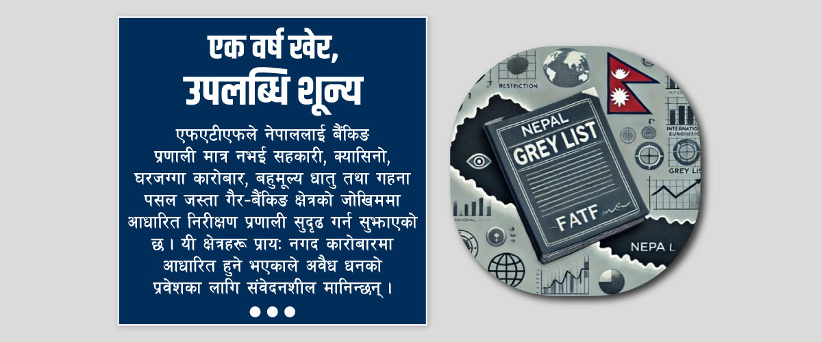 काठमाडौं । अन्तर्राष्ट्रिय वित्तीय प्रणालीमा पारदर्शिता, जवाफदेहिता र अवैध पैसाको नियन्त्रणको मापदण्ड निर्धारण गर्ने निकाय फाइनान्सियल एक्सन टास्क फोर्स (एफएटीएफ)को ग्रे लिस्टमा परेको एक वर्ष बितिसक्दा पनि नेपालले अपेक्षित सुधार देखाउन सकेको छैन । प्रारम्भिक चरणमा सरकारी तहबाट समयअगावै सूचीबाट बाहिर निस्कने आश्वासन दिइए पनि व्यवहारमा सुधारको गति सुस्त देखिएको छ । परिणामतः अब बाँकी रहेको समयभित्र नेपाल स्तरोन्नति हासिल गर्न सक्छ कि सक्दैन भन्ने प्रश्न गम्भीर रूपमा उठ्न थालेको छ ।