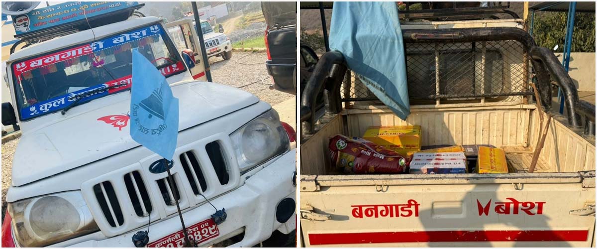 जिल्ला प्रहरी कार्यालय सल्यानका प्रहरी निरीक्षक देवराज भट्टराईले सोमबार बिहान बनगाड–कुपिण्डे नगरपालिका–१ सल्लीबजारमा रास्वपाको झण्डा प्रयोग भएको गाडीमा मदिरा, चामल लगायत वस्तुहरू फेला परेको जानकारी दिए ।