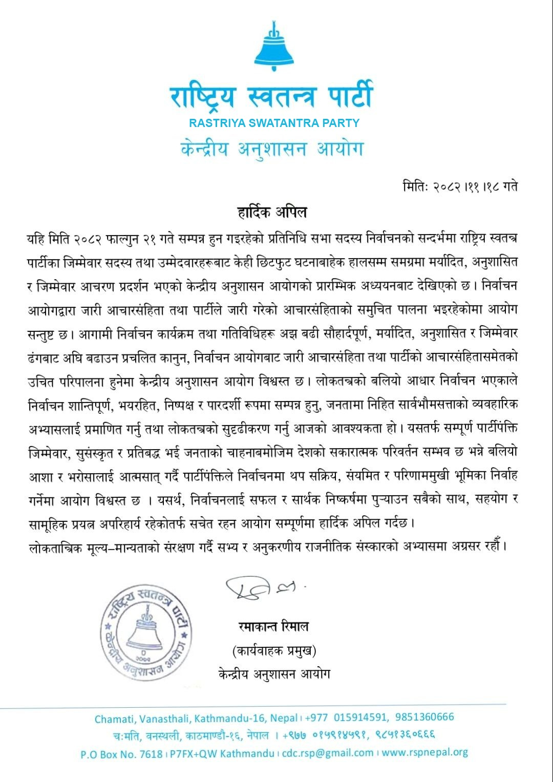 केन्द्रीय अनुशासन आयोगका कार्यवाहक प्रमुख रमाकान्त रिमालले राजी गरेको विज्ञप्तिमा केही छिटफुट घटनाबाहेक हालसम्म पार्टीका मर्यादित, अनुशासित र जिम्मेवार आचरण प्रदर्शन गरेको प्रारम्भिक अध्ययनबाट देखिएको उल्लेख छ ।