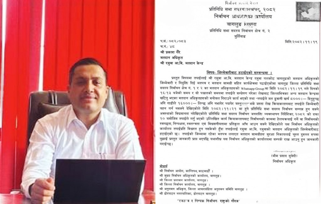 पत्रमा मतदान अधिकृतले गर्न नहुने किसिमका गतिविधि गरेको देखिएकाले जिम्मेवारीबाट हटाइएको उल्लेख छ ।