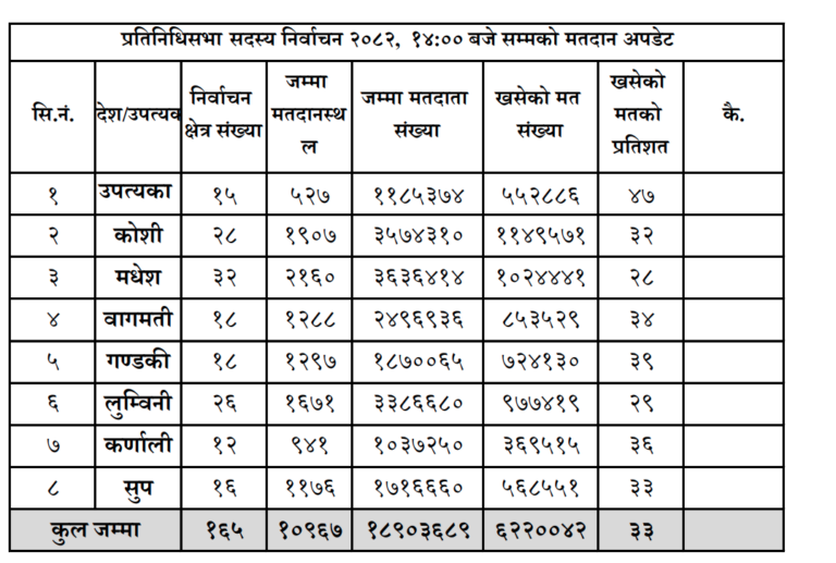 निर्वाचन आयोगका अनुसार देशभरिका १६५ निर्वाचन क्षेत्रमा दिउँसो २ बजेसम्म ६२ लाख २० हजार ४२ मत खसेको हो । बिहान ७ बजेदेखि मतदान भइरहको छ ।