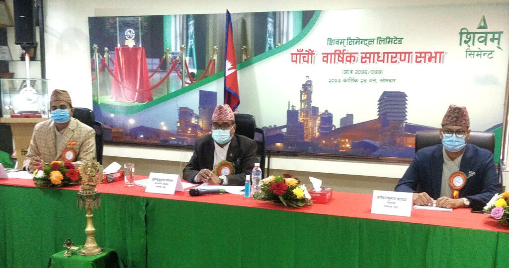 काठमाडौं, २४ कात्तिक । शिवम् सिमिन्ट्स लिमिटेडको पाँचौं बार्षिक साधारणसभा सम्पन्न भएको छ । शिवम् सिमेन्ट्स लिमिटेडको आव २०७६/७७ को वार्षिक साधारणसभा कात्तिक २४ गते सोमबारका दिन कम्पनीको कर्पाेरेट कार्यालय अनामनगर काठमाडौंको सभाहल तथा जुम वेविनार अनलाइन मिटिङमार्फत समेत सहभागिता जनाइ सम्पन्न गरेको हो ।