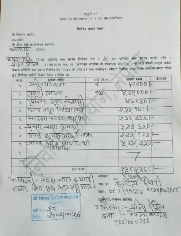 काठमाडौं क्षेत्र नम्बर ५ बाट प्रतिनिधिसभा सदस्य निर्वाचनमा उम्मेदवारी दिएका पौडेलले निर्वाचन कार्यालयमा बुझाएको विवरण अनुसार सबैभन्दा धेरै खर्च प्रचारप्रसार सामग्रीमा ५ लाख ५३ हजार ३५० रुपैयाँ भएको उल्लेख छ ।