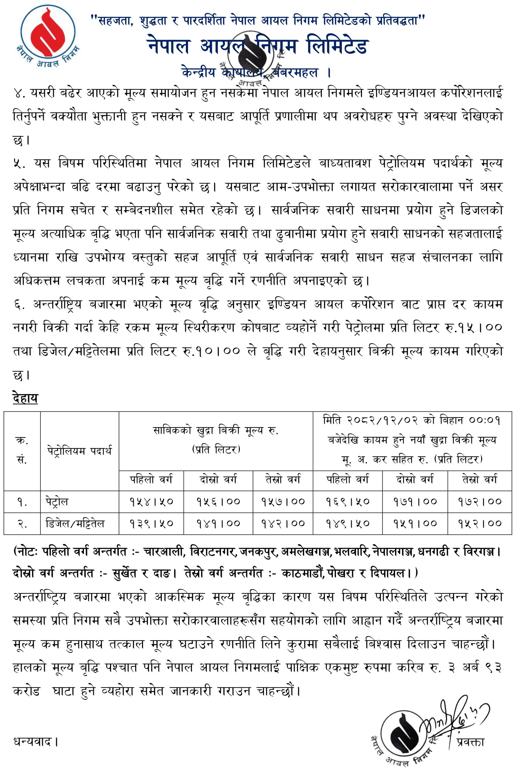 अन्तर्राष्ट्रिय बजारको मूल्यअनुसार हाल पेट्रोलियम पदार्थ तथा खाना पकाउने ग्यासको मूल्य वृद्धि नगरेर थोरै मात्र वृद्धि गरिएको निगमले जनाएको छ ।