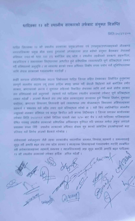 काठमाडौं । धादिङ जिल्लाका १३ वटै स्थानीय निकायहरूले सङ्घीय संसद्का सदस्यबाट हुने असंवैधानिक निर्देशनलाई अस्वीकार गर्ने बताएका छन् ।