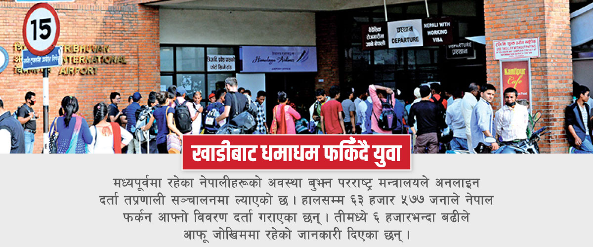 यसबीच मध्यपूर्वमा रहेका नेपालीहरूको अवस्था बुझ्न परराष्ट्र मन्त्रालयले अनलाइन दर्ता प्रणाली सञ्चालनमा ल्याएको छ । हालसम्म ६३ हजार ५७७ जनाले नेपाल फर्कन आफ्नो विवरण दर्ता गराएका छन् । तीमध्ये ६ हजारभन्दा बढीले आफू जोखिममा रहेको जानकारी दिएका छन् ।