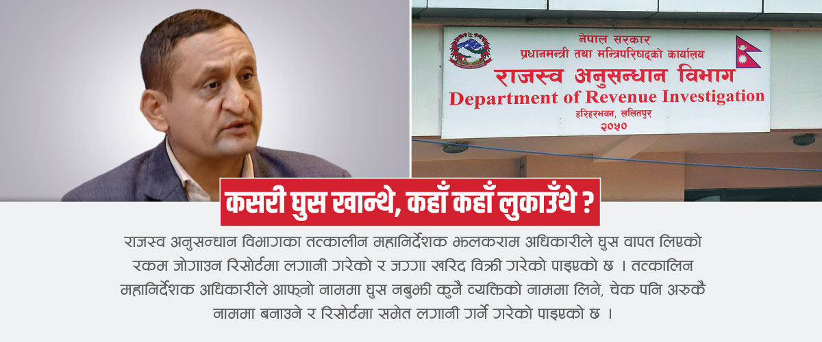 काठमाडौं । राजस्व अनुसन्धान विभागका तत्कालीन महानिर्देशक झलकराम अधिकारीले घुस वापत लिएको रकम जोगाउन रिसोर्टमा लगानी गरेको र जग्गा खरिद विक्री गरेको पाइएको छ । तत्कालिन महानिर्देशक अधिकारीले आफ्नो नाममा घुस नबुझी कुनै व्यक्तिको नाममा लिने, चेक पनि अरुकै नाममा बनाउने र रिसोर्टमा समेत लगानी गर्ने गरेको पाइएको छ ।