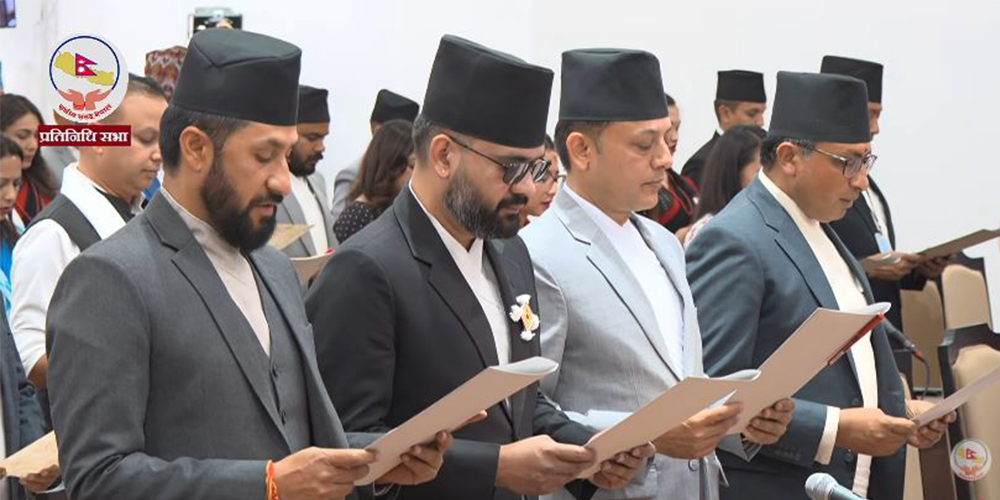 काठमाडौं । प्रतिनिधि सभाका नवनिर्वाचित सांसदहरुले पद तथा गोपनीयताको शपथ लिएका छन् । प्रतिनिधिसभाका ज्येष्ठ सदस्य अर्जुननरसिंह केसीले बिहीबार सांसदलाई पद तथा गोपनीयताको शपथ गराएका हुन् ।