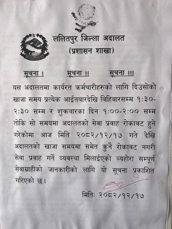 यसअघि कर्मचारीहरुका लागि प्रत्येक आईतबारदेखि बिहीबारसम्म १ः ३० देखि २ः३० बजेसम्म र शुक्रबार १ देखि २ सम्म दिउँसोको खाजा समय तोकिएको थियो । तर, मंगलबारदेखि अदालतको खाजा समयमा समेत कुनै रोकावट नगरी सेवा प्रवाह गर्ने व्यवस्था मिलाइएको सूचनामा उल्लेख छ ।