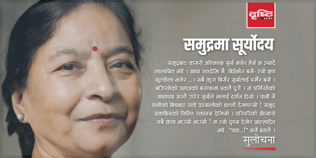 पहाडबाट सूर्योदय हेर्न विभिन्न देशका पर्यटकहरू नेपाल आउने गर्छन् । पहाडको चुचुरोबाट सूर्य उदाएको मैले पनि धेरै पटक देखेकी छु । तर, समुद्रबाट कसरी जन्मिन्छ सूर्य भनेर हेर्न म ज्यादै लालायित भएँ । आधा रातदेखि नै बिउँझेर बसेँ– त्यो क्षण फुत्केला भनेर …।
