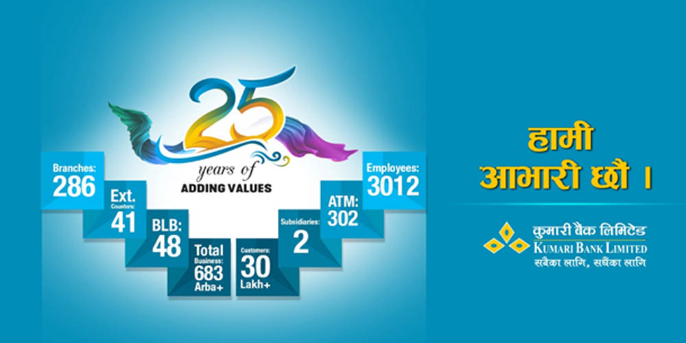 काठमाडौं । कुमारी बैङ्क लिमिटेडले आफ्नो २५ औँ वार्षिकोत्सव मनाएको छ । २५ औँ  वार्षिकोत्सवको अवसरमा कुमारी बैङ्क लिमिटेडले आफ्ना सम्पूर्ण ग्राहक वर्ग, सेयरधनी, नियामक निकाय तथा शुभचिन्तकहरूलाई कृतज्ञता ज्ञापन गर्दै गरेको छ ।