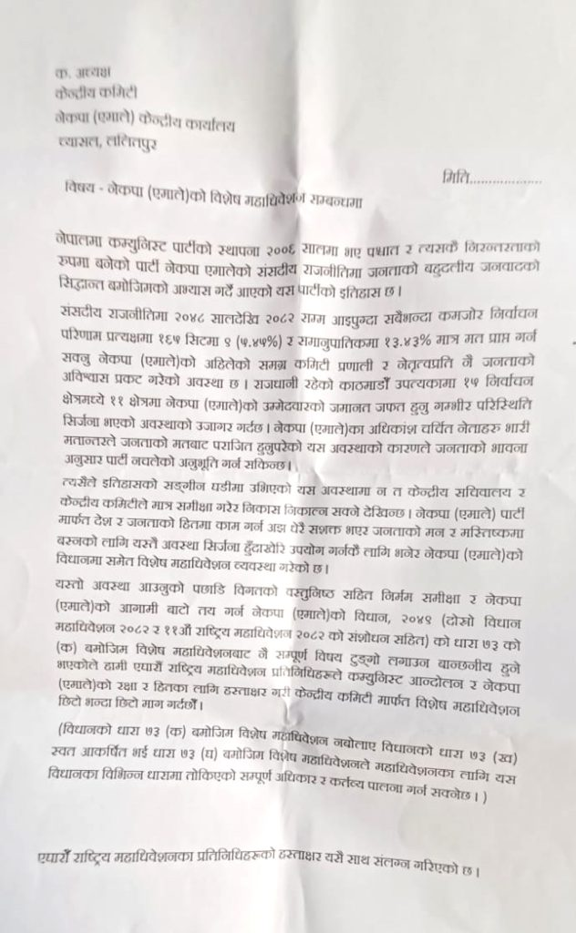केन्द्रीय सचिवालय र केन्द्रीय कमिटीले मात्र समीक्षा गरेर निकास ननिस्कने भन्दै विशेष महाधिवेशन आवश्यक रहेको निवेदनमा उल्लेख छ । युवा नेताहरूले मुख्य रूपमा यो अभियान चलाइरहेका छन् । शुक्रवार च्यासलमा बसेको ६ घण्टे सचिवालय बैठकले निर्वाचनको संक्षिप्त समीक्षा गरेको थियो । बैठकले निर्वाचन परिणामप्रति सम्मान व्यक्त गर्दै बालेन शाहको सरकारलाई बधाई दिएको छ ।