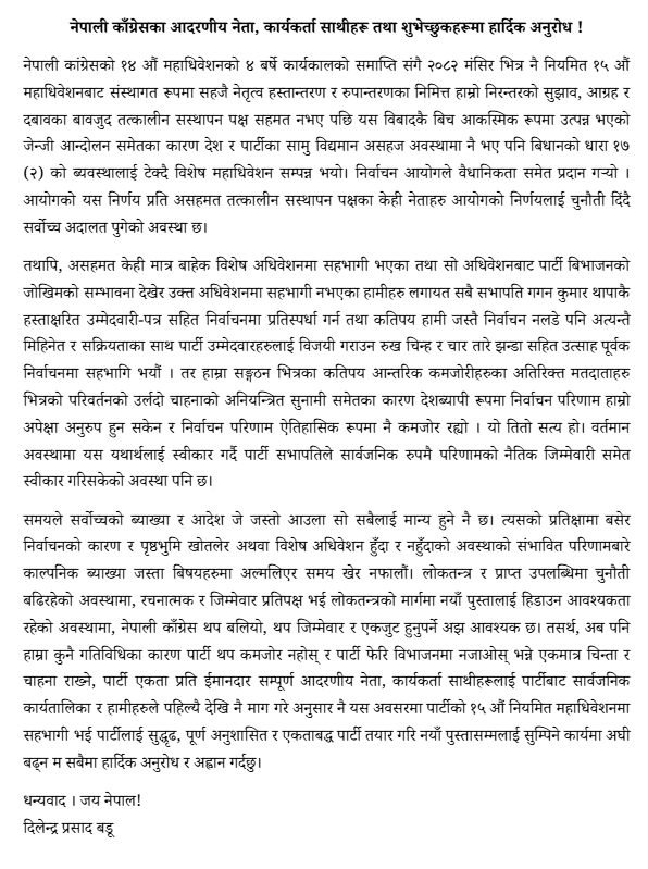 बडूले सर्वोच्च अदालतले पार्टीको आधिकारिकताका विषयमा गर्ने फैसला सबैले मान्नुपर्ने बताएका छन् । उनले निर्वाचनको कारण वा विशेष महाधिवेशन हुँदा नहुँदाको अवस्थाको काल्पनिक व्याख्यामा अलमलिएर समय खेर नफाल्न आग्रह गर्दै लोकतान्त्रिक उपलब्धिलाई बचाउन र नयाँ पुस्तालाई लोकतन्त्रको मार्गमा हिँडाउन कांग्रेस थप बलियो, जिम्मेवार र एकताबद्ध हुनुपर्ने बताएका छन् ।