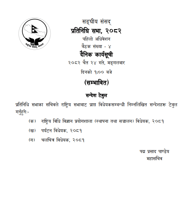 आजको बैठकमा ‘राष्ट्रिय विधि विज्ञान प्रयोगशाला (स्थापना तथा सञ्चालन ) विधेयक, २०८१’, ‘पर्यटन विधेयक, २०८१’ र ‘चलचित्र विधेयक, २०८१’ प्रस्तुत गर्ने सम्भावित कार्यसूची रहेको संसद सचिवालयले जनाएको छ ।