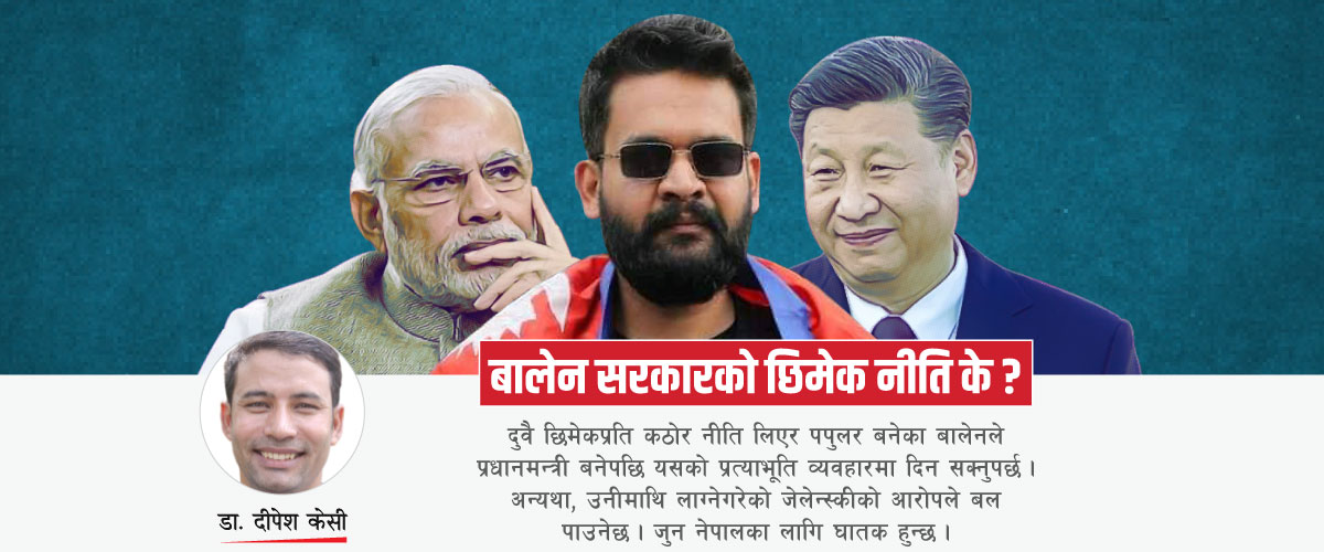 प्रधानमन्त्री भएपछि उनको सोच र नीतिमा के कति परिवर्तन आयो व्यवहारबाट देखिने नै छ । विगतमा चुच्चे नक्शाको कारण देखाएर छिमेकी चीन भ्रमण नै नगरेका बालेनले त्यही नक्शाभित्र बनेको लिपुलेक पास मार्गबाट भारत र चीनबीच २०८३ जेठ १ बाट व्यापार सुरु हुने घोषणा भइसकेको विषयमा चुपचाप छन् । यसबाट छिमेक विरोधी राष्ट्रवादको टाँगा चढेर सत्तामा उक्लने विगतका कतिपय प्रधानमन्त्रीहरुको रणनीतिको लगाम उनले पनि समाएका हुन् कि भन्ने आशंका गर्ने ठाउँ छ । ‘भारतसँग सुरुङ युद्ध’ गर्छु भन्ने प्रचण्ड हुन् या अयोध्या नेपालमा पर्छ र राम नेपालमा जन्मिएका हुन् भन्ने ओली राष्ट्रवादी दर्ज भई सत्तामा पुग्ने मत बढाउन सफल भएकै थिए ।
