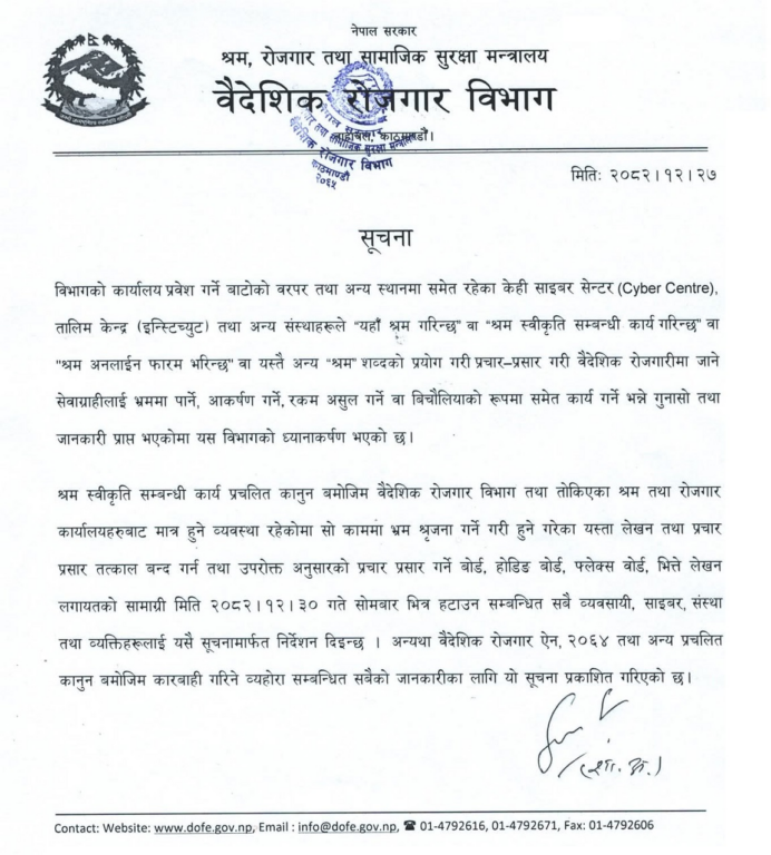 ‘यहाँ श्रम गरिन्छ’, ‘श्रम स्वीकृतिसम्बन्धी कार्य गरिन्छ’, ‘श्रम अनलाइन फारम भरिन्छ’ वा अन्य ‘श्रम’ सम्बन्धी भ्रमपूर्ण सूचानाले वैदेशिक रोजगारीमा जाने सेवाग्राहीलाई भ्रममा पार्ने गरेको भन्दै विभागले सूचना नै जारी गरेर ती सूचना तत्काल हटाउन निर्देशन दिएको हो ।