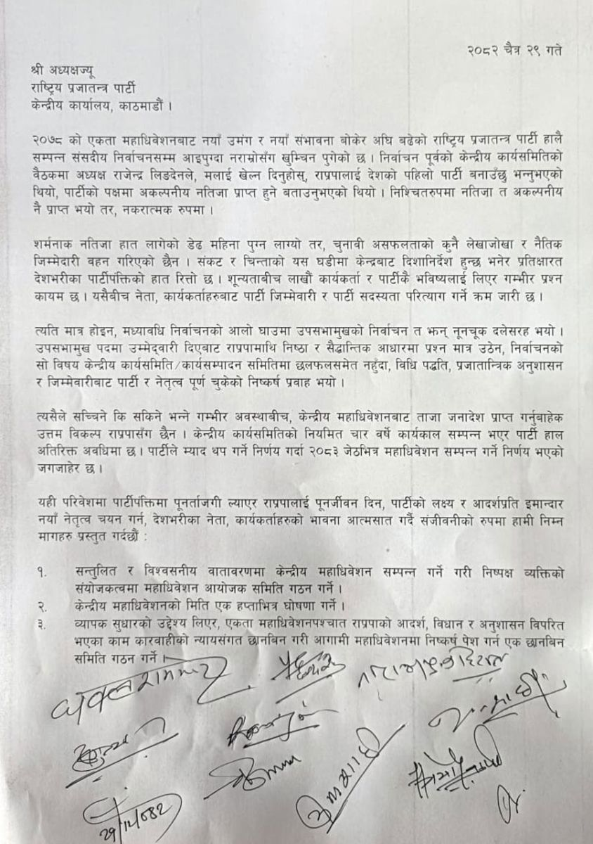 काठमाडौं । राष्ट्रिय प्रजातन्त्र पार्टी राप्रपामा महाधिवेशन गर्ने माग भइरहेको छ  । पार्टीले प्रतिनिधि सभा निर्वाचनमा भोगेको हारको समीक्षा नेतृत्वले नगरेको भन्दै पार्टीका महामन्त्रीसहितका ११ जनाले पार्टी महाधिवेशनको आह्वान गर्दै अध्यक्ष राजेन्द्र लिङ्देनले विकल्प खोज्‍नुपर्ने माग गरेका छन् ।