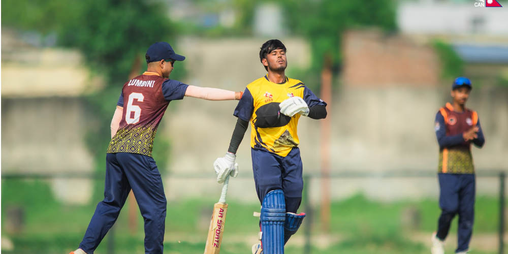 लुम्बिनीका सन्तोष यादवले ८२ र सलाहुद्दीन खानले ६० रन बनाए । दिनेश बोहोराले २० र कप्तान देव खनालले १४ रन बनाए ।