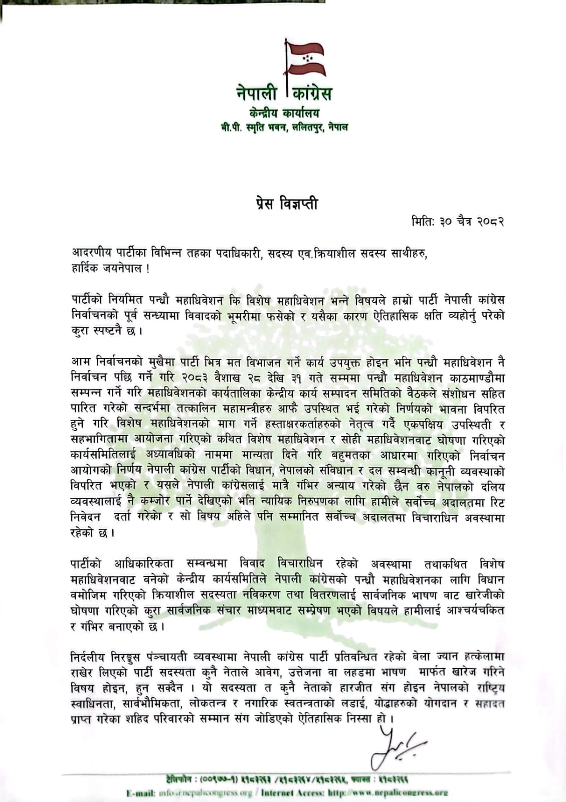 खड्काले पार्टीको आन्तरिक विवाद सर्वोच्च अदालतमा विचाराधीन रहेको अवस्थामा कुनै एक पक्षले महाधिवेशन घोषणा गर्नु वदनियतपूर्ण भएको बताए ।
