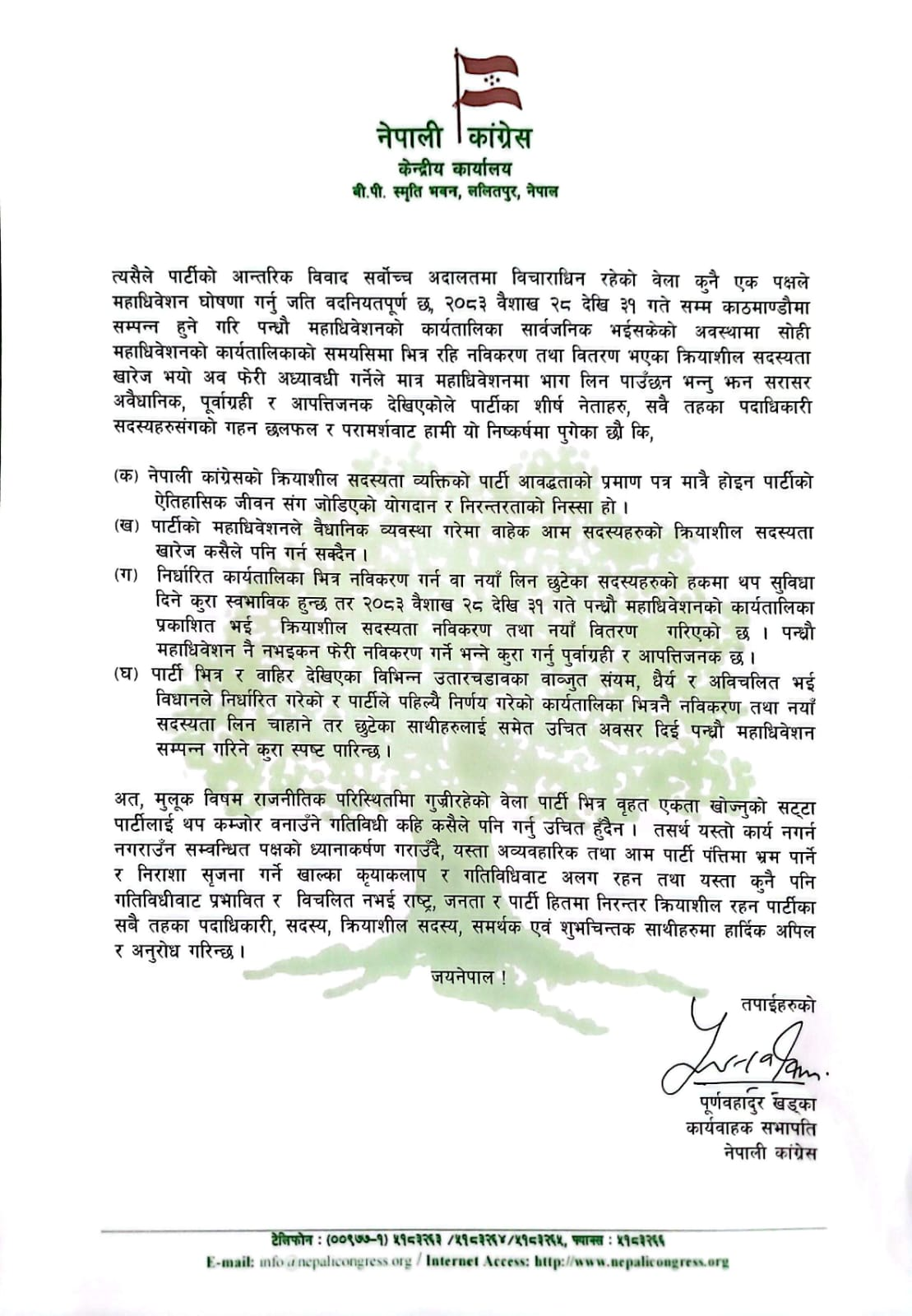 कार्यवाहक सभापतिको हैसियतमा सोमबार विज्ञप्ति जारी गर्दै खड्काले नेपाली कांग्रेसको क्रियाशील सदस्यता व्यक्तिको पार्टी आबद्धताको प्रमाणपत्र मात्र नभई पार्टीको ऐतिहासिक जीवनसँग जोडिएको योगदान र निरन्तरताको निस्सा भएको उल्लेख गरेका छन् ।