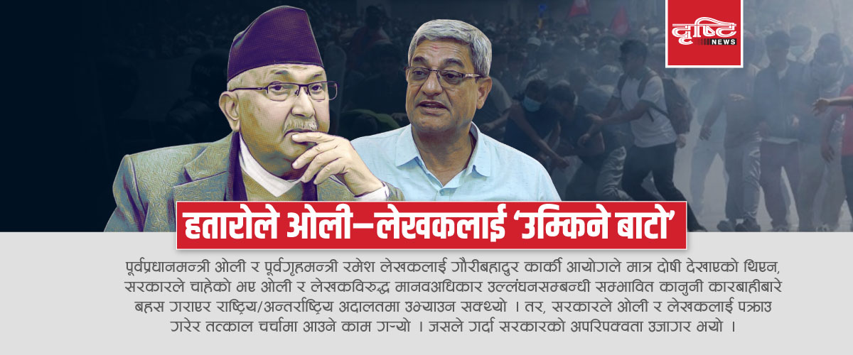 काठमाडौं । पूर्वप्रधानमन्त्री केपी शर्मा ओली र पूर्वगृहमन्त्री रमेश लेखकलाई गौरीबहादुर कार्की आयोगले मात्र दोषी देखाएको थिएन, सरकारले चाहेको भए ओली र लेखकविरुद्ध मानवअधिकार उल्लंघनसम्बन्धी सम्भावित कानुनी कारबाहीबारे बहस गराएर राष्ट्रिय÷अन्तर्राष्ट्रिय अदालतमा उभ्याउन सक्थ्यो ।