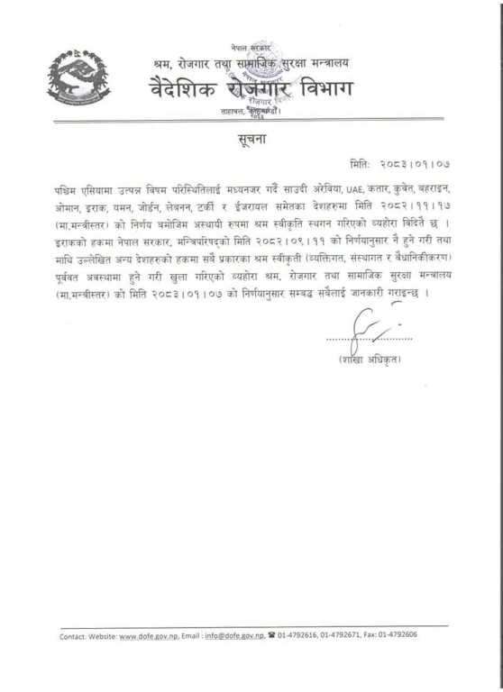 इरान युद्धका कारण पश्चिम एसियाली क्षेत्रमा उत्पन्न विषम परिस्थितिका कारण सुरक्षा संवेदनशीलतालाई मध्यनजर गर्दै सरकारले फागुन १७ गते ती मुलुकहरूमा वैदेशिक रोजगारीमा जान अस्थायी रूपमा रोक लगाएको थियो ।