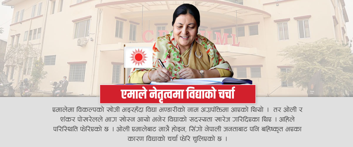 एमालेमा विकल्पको खोजी भइरहँदा विद्या भण्डारीको नाम अग्रपंक्तिमा आएको थियो । तर ओली र शंकर पोखरेलले भाग खोस्न आयो भनेर विद्याको सदस्यता खारेज गरिदिएका थिए । अहिले परिस्थिति फेरिएको छ । ओली एमालेबाट मात्रै होइन, सिंगो नेपाली जनताबाट पनि बहिष्कृत भएका कारण विद्याको चर्चा फेरि चुलिएको छ । थापागाउँस्थित विद्याको सम्पर्क कार्यालयमा एमालेका पुराना नेता कार्यकर्ताहरूको भीड बढ्न थालेको छ ।