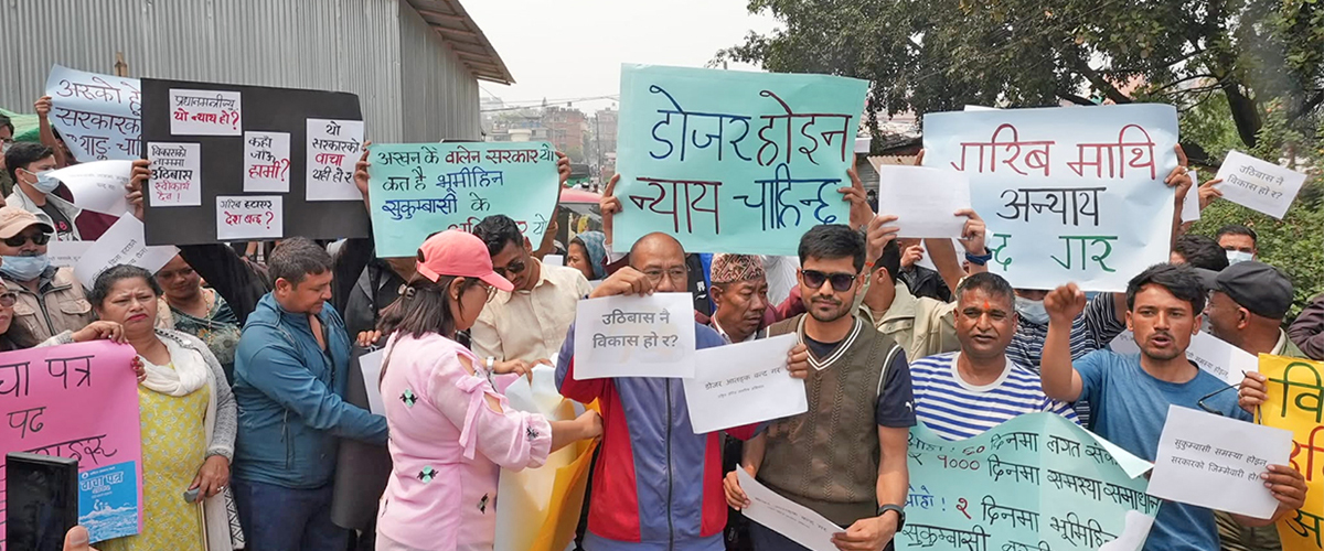 उनीहरुले डोजर आतंक बन्द गर, सुकुम्वासी आवासको हक सुनश्चित गर, निरंकुश सरकार चाहिँदैन लगायतका नारा लगाइरहेका छन् ।