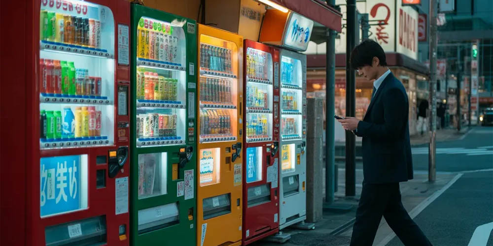 जापानमा भेन्डिङ मेसिनहरू अत्यन्तै सामान्य छन्‌-यी पोस्ट अफिस, पार्क, रेल स्टेसन, सडक किनार मात्र होइन, माउन्ट फुजीजस्ता दुर्गम स्थानहरूमा समेत पाइन्छन् । तर अहिले उपभोक्ताको खर्च गर्ने व्यवहार बदलिँदै जाँदा यो व्यवसाय दबाबमा परेको छ ।
