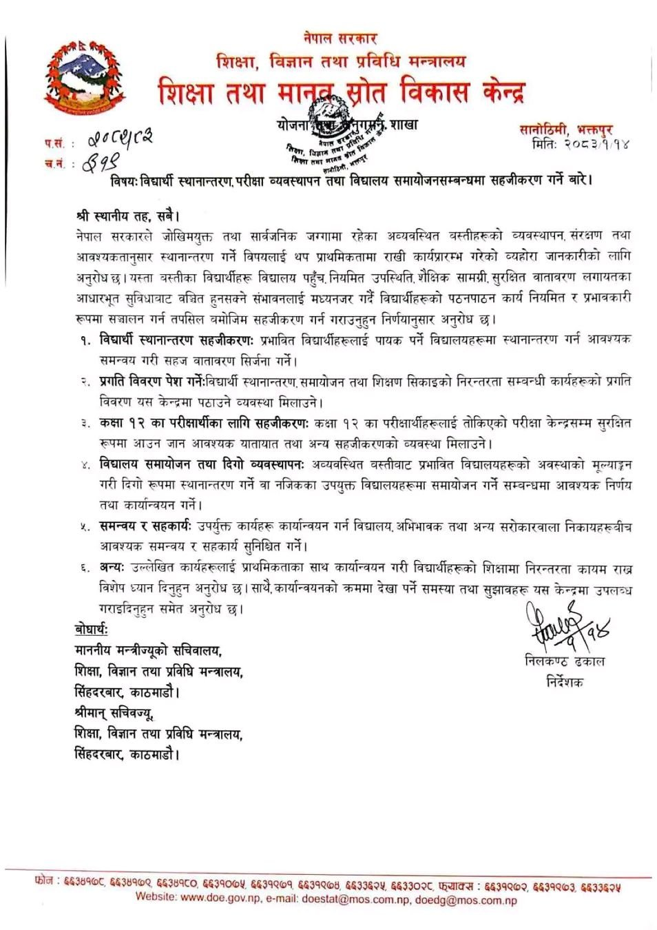 मन्त्रीको निर्देशन पछि मन्त्रालय अन्तर्गतको शिक्षा तथा मानव स्रोत विकास केन्द्रले अव्यवस्थित बस्ती स्थानान्तरण हुँदा त्यहाँ विद्यार्थीको परीक्षा व्यवस्थापन, प्रभावित वस्तिमै रहेका विद्यालय समायोजन तथा समन्वयलाई प्रभावकारी बनाउन विभिन्न ६ बुँदे सर्कुलर जारी गरिएको छ ।