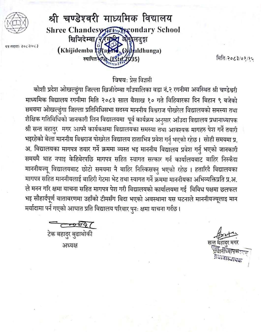 सांसद पोखरेलले प्रअ मगरलाई थर्काएको भिडिओ सामाजिक सञ्जालमा भाइरल भएपछि पोखरेलले गल्ती स्वीकार गर्दै माफी मागेका थिए । प्रअ मगर र विद्यालयका अध्यक्ष टेकबहादुर बुढाथोकीले आज विज्ञप्ति जारी गर्दै घटनाबारे बोलेका छन् ।