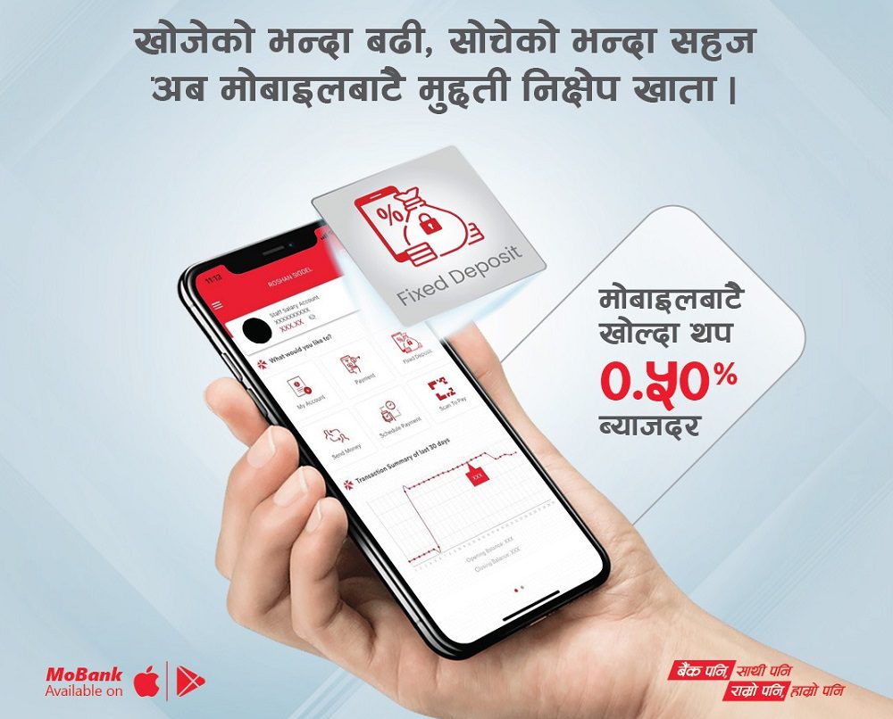 बैंकका अनुसार ग्राहकहरूले कम्तिमा तीन महिनादेखि अधिकतम १० वर्षभन्दा बढी समयका लागि व्यक्तिगत मुद्दती निक्षेप गर्न सक्नेछन् भने वार्षिक ब्याजदर सुविधा क्रमशः ७.२५ देखि ९.७५ प्रतिशतसम्म प्राप्त गर्न सक्नेछन् । मोबाइल बैंकिङमार्फत मुद्दती खाता खोल्नु हुने ग्राहकहरूले बैंकले प्रकाशित सम्पूर्ण किसिमका मुद्दती निक्षेपको ब्याजदरमा ०.५ प्रतिशत थप गर्ने व्यवस्था गरेको छ ।