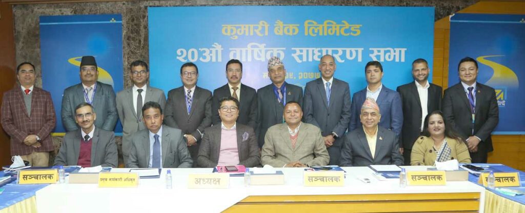 काठमाडौं । कुमारी बैंक लिमिटेडको २०औं वार्षिक साधारणसभा बैंकका अध्यक्ष अमिरप्रताप जबराको अध्यक्षतामा रजिष्टर्ड कार्यालय, टंगाल, काठमाडौँमा सम्पन्न भएको छ । उक्त साधारण सभाले लेखापरीक्षकको प्रतिवेदन सहितको आ.व.२०७६/७७ को आर्थिक विवरण, वासलात, नाफा नोक्सान हिसाब र सोही अवधिको नगद प्रवाह विवरण, नाफा नोक्सान बाँडफाँट हिसाब, पूँजीमा भएको परिवर्तन लगायत वार्षिक प्रतिवेदन माथि छलफल गरी पारित गरेको छ । कोरोनाको उच्च जोखिमलाई मध्यनजर गर्दै, बैंकले अन्लाइन प्लाट्फोर्म जूममार्फत शेयरधनि महानुभावहरुको धारणा समावेश गरेको थियो ।