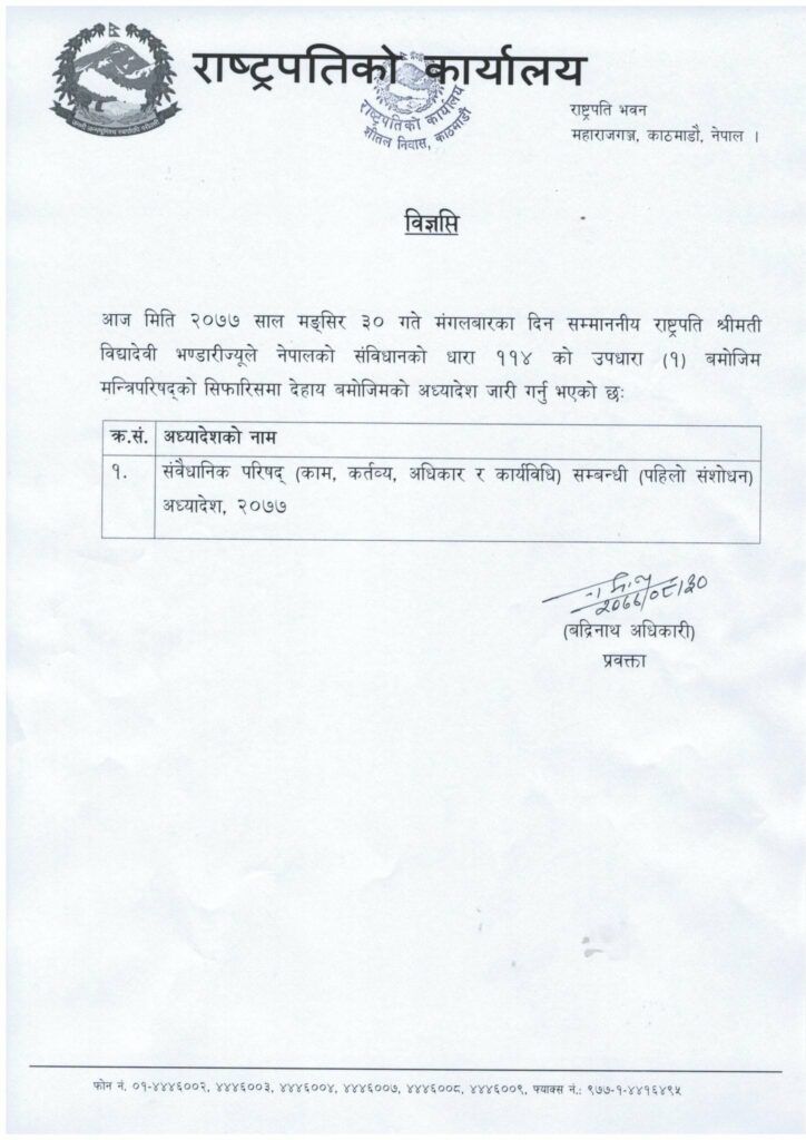 सरकारले संवैधानिक निकायमा नियुक्तिका लागि अध्यादेशमार्फत संवैधानिक परिषद् ऐन संशोधन गरेको छ । मंगलबार दिउँसो बसेको मन्त्रिपरिषद् बैठकले ऐन संशोधन गरेको हो । राष्ट्रपति कार्यालयबाट अध्यादेश जारी भइसकेको छ ।