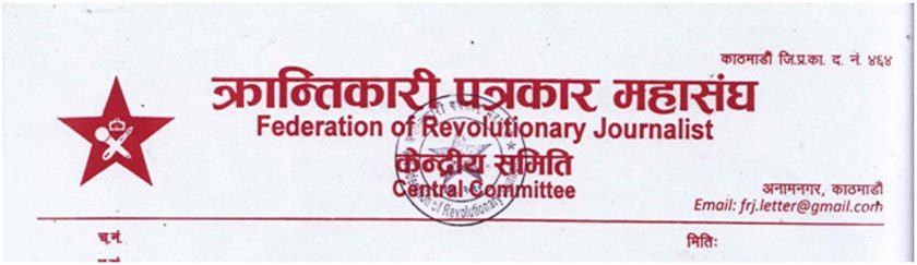 काठमाडौं, २२ पुस । क्रान्तिकारी पत्रकार महासंघले जनपत्रकार संगठन, नेपालका संयोजक शेरबहादुर विश्वकर्मा, सो संगठनका उपत्यका संयोजक मानध्वज लामा र नेपाल पत्रकार महासंघ काठमाडौं शाखाका सचिव मोहन पन्तलाई पुस २० गते नेपाल प्रहरीको केन्द्रीय अनुसन्धान व्यूरो (सिआइबी)को टोलीले विनाकारण नियन्त्रणमा लिएर आतंकित बनाएको घटनाप्रति क्रान्तिकारी पत्रकार महासंघको गम्भीर ध्यानाकर्षण भएको जनाएको छ । महासंघका अध्यक्ष इन्द्र राउतले एक विज्ञप्ति प्रकाशित गरी ‘प्रेस तथा विचार अभिव्यक्ति स्वतन्त्रता विरोधी राज्यको यो फासिवादी चरित्र प्रदर्शनको हाम्रो संगठन घोर भत्र्सना गर्दै कडा शब्दमा निन्दा गर्दछ’ भनिएको छ ।