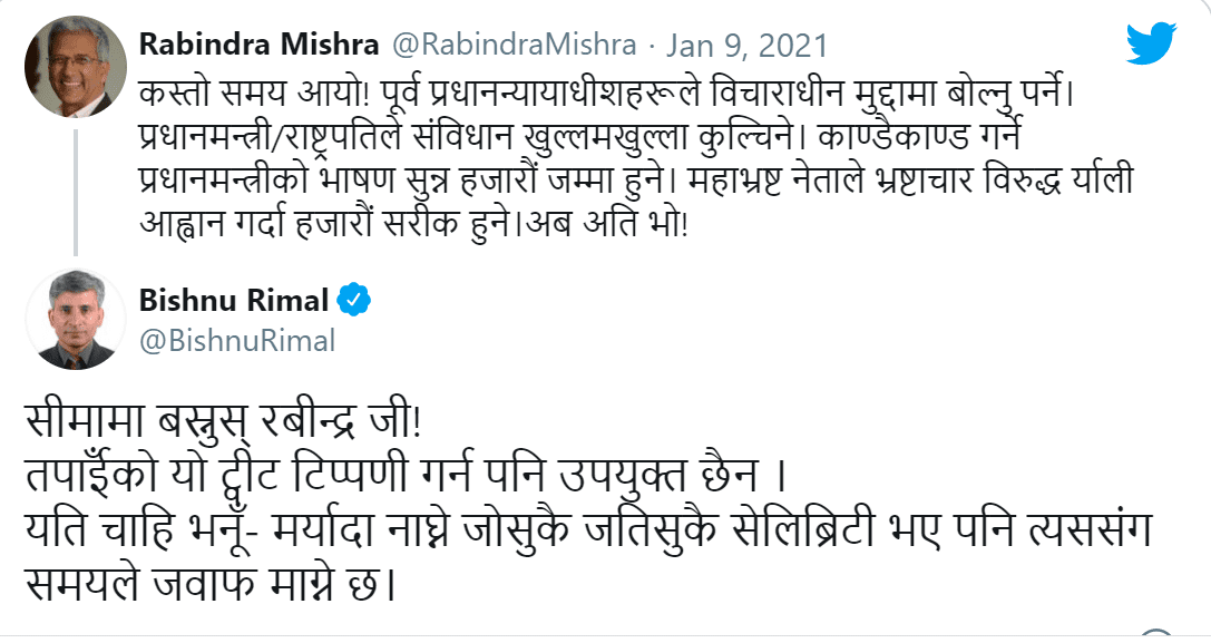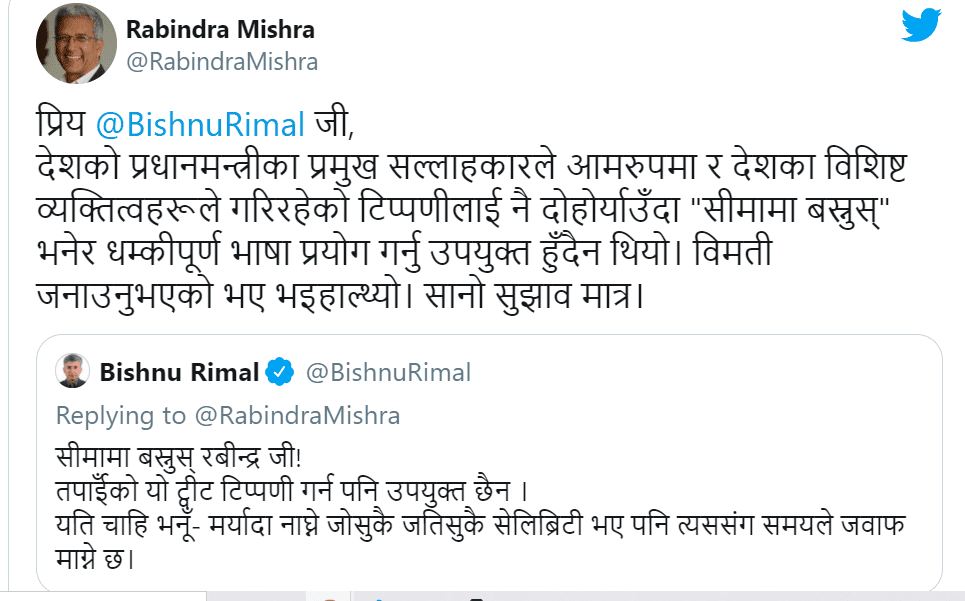 ‘सीमामा बस्न’ भन्दै रिमालले ट्वीटरमा मिश्रलाई धम्की दिएका हुन् । यो कदमको सामाजिक सञ्जालमा चर्काे आलोचना भइरहेको छ ।