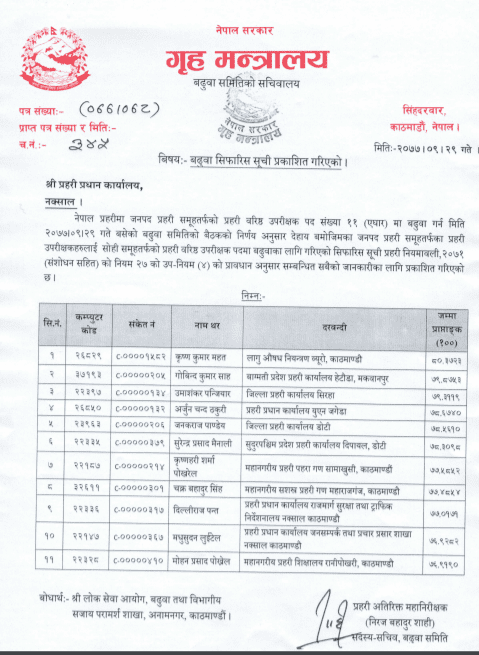 समितिले सिनियर एसपीहरु कृष्णकुमार महत, गोविन्द कुमार साह, उमाशंकर पञ्जियार, अर्जुन चन्द ठकुरी, जनकराज पाण्डेय, सुरेन्द्र प्रसाद मैनाली, कृष्णहरी शर्मा पोखरेल, चक्रबहादुर सिंह, दिल्लीराज पन्त, मधुसुदन लुईटेल र मोहन प्रसाद पोख्रेललाई बढुवा सिफारिस गरेको हो । गृहसचिव महेश्वर न्यौपानेको अध्यक्षतामा बसेको बैठकले सिफारिस गरेको हो ।