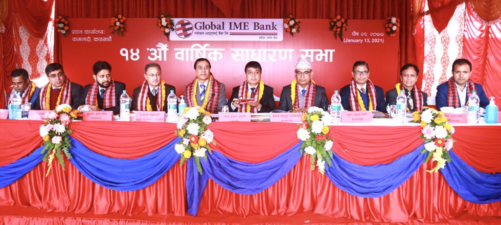 काठमाडौं । ग्लोबल आइएमई बैंक लिमिटेडको १४औँ वार्षिक साधारणसभा २०७७ पुस २९ गते बुधबार बैंकको कर्पोरेट भवन कमलादी काठमाडौंमा सम्पन्न भएको छ । आर्थिक वर्ष २०७६/७७ को कुल मुनाफाबाट शेयरधनीलाई प्रस्ताव गरेको १४ प्रतिशत बोनश शेयर र दुई प्रतिशत नगद लाभांश गरी १६ प्रतिशत लाभांश दिने निर्णयलाई पारित गर्दै बैंकको १४औँ वार्षिक साधारणसभा सम्पन्न भएको हो ।