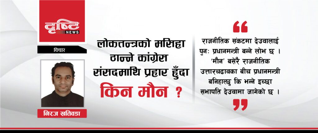 कांग्रेस सभापति देउवा निर्वाचनमा जान आतुर रहेको पछिल्ला अभिव्यक्तिहरुले पुष्टि गर्छ । उनले कांग्रेस निर्वाचनका लागि पनि तयार रहेको मात्र बताउँने गरेका छैनन, सर्वोच्च अदालतको फैसला अघि प्रतिनिधिसभा विघटन विरुद्ध चर्को आवाज नउठाउने उनको रणनीतिले लोकतन्त्रको मसिहा ठान्ने कांग्रेसलाई गिज्याइरहेको छ । यही राजनीतिक संकटमा उनलाई पुनः प्रधानमन्त्री बन्ने लोभ छ । ‘मौन’ बसेरै राजनीतिक उत्तारचढावका बीच आफू प्रधानमन्त्री बनिहाल्छु कि भन्ने इच्छा सभापति देउवामा जागेको छ ।