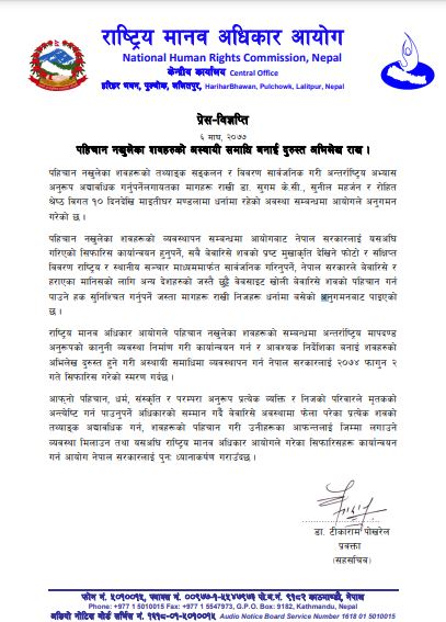 ‘आफ्नो पहिचान, धर्म, संस्कृति र परम्परा अनुरूप प्रत्येक व्यक्ति र उसको परिवारले मृतकको अन्त्येष्टि गर्न पाउनुपर्ने अधिकारको सम्मान गर्दै बेवारिसे अवस्थामा फेला परेका प्रत्येक शवको तथ्याङ्क अद्यावधिक गर्न, शवको पहिचान गरी उनीहरूका आफन्तलाई जिम्मा लगाउने व्यवस्था मिलाउनुपर्ने’ – विज्ञप्तिमा भनिएको छ । आयोगले पहिचान नखुलेका शवको सम्बन्धमा अन्तर्राष्ट्रिय मापदण्ड अनुरूपको कानुनी व्यवस्था निर्माण गरी कार्यान्वयन गर्न र आवश्यक निर्देशिका बनाई शवको अभिलेख दुरुस्त हुने गरी अस्थायी रुपमा व्यवस्थापन गर्न सरकारलाई ३ वर्ष अघि २०७४ फागुन २ गते सिफारिस गरेको पनि स्मरण गराएको छ ।