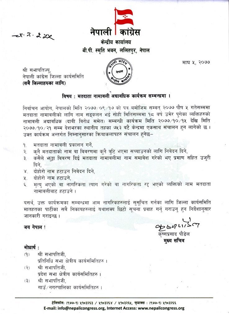 कांग्रेस केन्द्रीय कार्यालयका मुख्यसचिव कृष्णप्रसाद पौडेलले सोमाबार मतदाता नामावली अद्यावधिक कार्यक्रममा सहभागी हुन सबै जिल्ला सभापति परिपत्र गरेको खुलेको छ ।