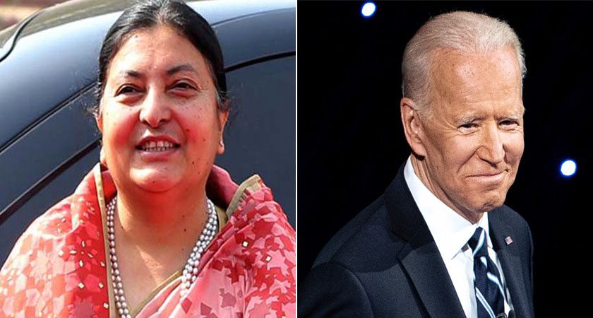 काठमाडौं, ८ माघ । राष्ट्रपति विद्यादेवी भण्डारीले अमेरिकी राष्ट्रपति जो बाइडनलाई बधाई दिएकी छन् । बाइडेनलाई बधाई सन्देश दिँदै भण्डारीले उनको कार्यकालमा नेपाल अमेरिका सम्बन्ध अझ गहिरो र विस्तार हुने विश्वास व्यक्त गरेकी छन् ।