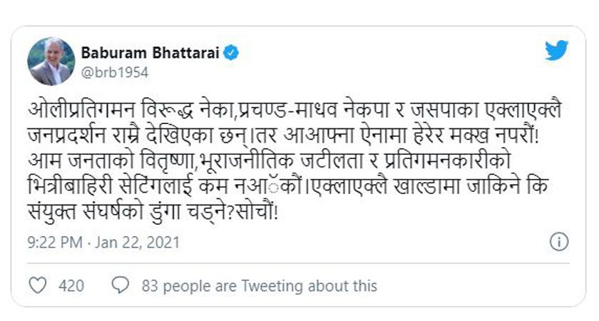 शुक्रबार साझ ट्वीट गर्दै उनले प्रतिनिधिसभा विघटन विरुद्ध दलहरुको एक्लाएक्लै जनप्रदर्शन राम्रै नदेखिएको भन्दै दलहरुलाई संयुक्त आन्दोलनमा उत्रन आव्हान गरेका हुन् । प्रधानमन्त्री केपी ओलीको संसद विघटन निर्णयविरुद्ध नेपाली काँग्रेस प्रचण्ड माधव नेकपा र जसपाको एक्लाएक्लै जनप्रदर्शन राम्रै नदेखिएको उनको भनाई छ ।