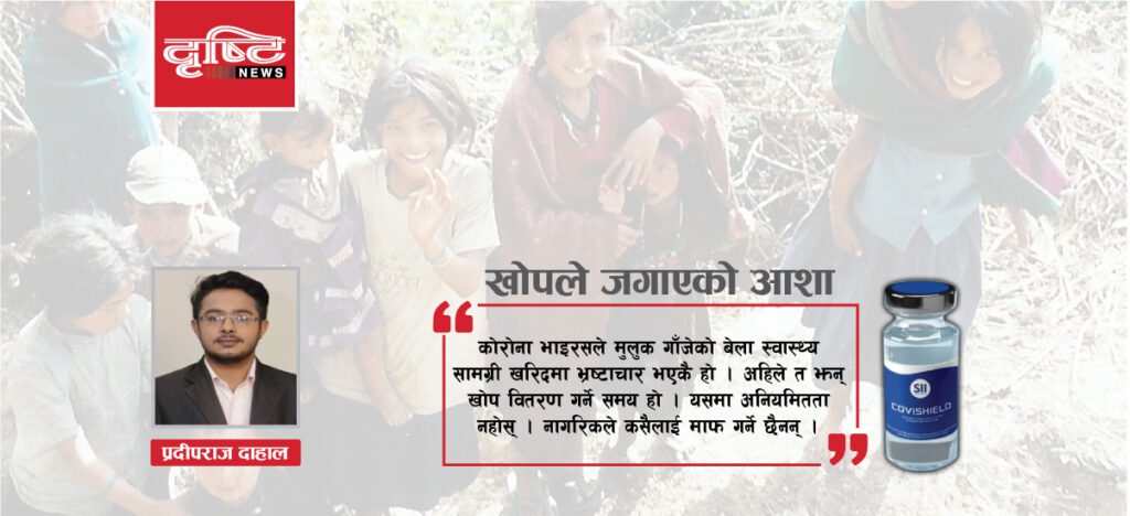 बिडम्बना भन्नुपर्छ, हाम्रो देशमा नागरिक बचाउन खरिद गरिएको स्वास्थ्य सामग्रीमै भ्रष्टाचार भयो । मन्त्रीहरु नै अग्रसर भए ! कोरोनाबाट नागरिकलाई बचाउन भन्दै सरकारले लकडाउन गर्यो । तर, नागरिक भोकभाकै मर्ने अवस्था आयो । खोप पाउने त कुरै भएन । यस्तो हालतमा सरकारले खोप खोज्ने कुरा परिकल्पना पनि गर्न सकिन्न । बरु सरकारले भारतसँग भीख मागेको छ । त्यो भीखमा पनि जनता प्राथमिकतामा पर्छ कि पर्दैन, हेर्नु पर्नेछ ।