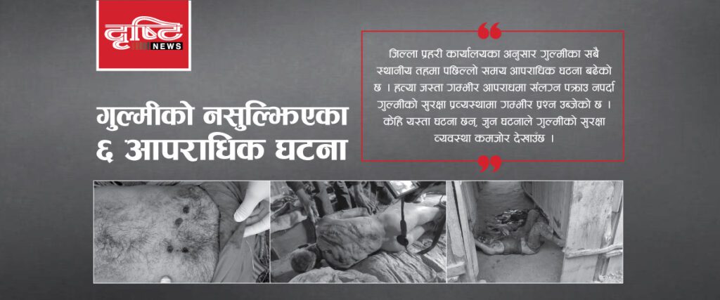गुल्मी, ११ माघ । गुल्मीमा पछिल्लो समय आपराधिक गतिविधि बढ्दो छ । सुरक्षाकर्मीको बाक्लो उपस्थिति रहेतापनि आपराधिक गतिविधि रोकिएको छैन । जिल्ला प्रहरी कार्यालयका अनुसार गुल्मीका सबै स्थानीय तहमा आपराधिक घटना बढेको छ । हत्या जस्ता गम्भीर अपराधमा संलग्न पक्राउ नपर्दा गुल्मीको सुरक्षा व्यवस्था कमजोर हुँदै गएको छ ।