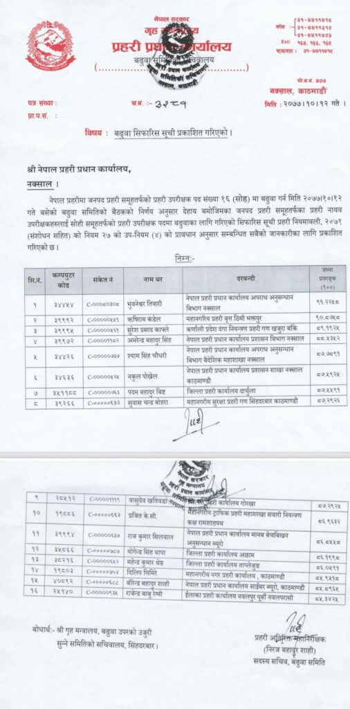 १६ डिएसपी एसपी बढुवामा सिफारिस भएका छन् । बढुवा समितिको बैठकले सोमबार बढुवा सिफारिस गरेको हो ।