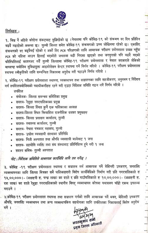 जिल्लामा कारोना संक्रमणको दर दैनिक बढेको बेला कोरोना परीक्षण गर्न जिल्ला बाहिर जानुपर्ने भएकाले भनेकै समयमा रिर्पोट आउँदैन्थ्यो । जिल्लाका स्थानीय तहनै सबै भन्दा बढी समस्यामा थिए । बिस्तारै जिल्लामा प्रयोगशालानै संचालन गर्ने योजना बन्यो । परराष्ट्र मन्त्री प्रदिप ज्ञवालीको पहलमा स्थापना भएको प्रयोगशाला उनले नै उद्घाटन गरे । तर, स्थानीय तहबीच समन्वय नहुँदा कर्मचारीले पारिश्रमिक पाएका छैनन् ।